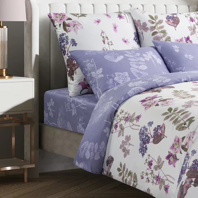 Аквилегия — это комплект из сатина (хлопок) с продуманной расцветкой и двухсторонним пододеяльником: можно быстро менять настроение спальни — повернули на другую сторону, и у вас новый акцент без лишних покупок. Это изящное постельное белье, выполненное в нежных тонах, представляет собой белоснежное полотно, щедро украшенное утонченным цветочным узором. На его фоне расцветают акварельные соцветия и листья в палитре от мягкого сиреневого и глубокого фиолетового до бледного розового и свежего зеленого, создавая ощущение весеннего сада и придавая спальне атмосферу безмятежности и романтики.