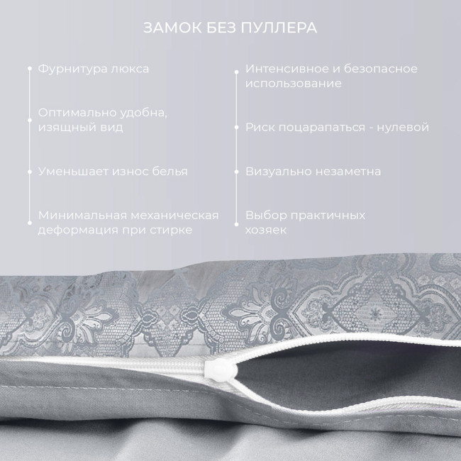 Наволочки комплекта украшены широкими декоративными воланами – «ушками», в пододеяльник вшита молния, это значительно облегчает заправку одеяла. Постельное белье изготовлено из гладкого шелковистого хлопка-сатина высокой плотности, это очень красивый и прочный материал. Ткань с сатиновым плетением не деформируется и не дает усадки, цвета этого постельного белья не поблекнут после многократных стирок.