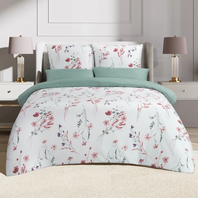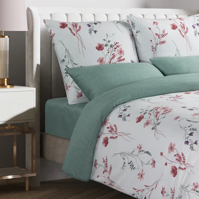 Монсан — это комплект из сатина (хлопок) с продуманной расцветкой и двухсторонним пододеяльником: можно быстро менять настроение спальни — повернули на другую сторону, и у вас новый акцент без лишних покупок. Этот комплект постельного белья, словно легкая акварельная зарисовка весеннего луга, раскрывается на безупречно белом полотне. Его поверхность усеяна изящными стеблями и нежными бутонами полевых цветов, расцветающих в деликатных переливах розового, приглушенного бордового и фиолетового, с тонкими вкраплениями зеленой листвы, что создает ощущение безмятежной природной гармонии. Основные подушки гармонично вторят этому воздушному цветочному мотиву, в то время как две дополнительные подушки и элегантный отворот пододеяльника выполнены в спокойном, приглушенном оттенке шалфейно-зеленого, деликатно завершая композицию и придавая всему ансамблю утонченную свежесть и умиротворение.