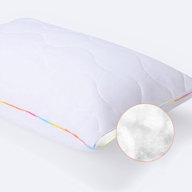 Натуральное хлопковое волокно расположено в стёганом чехле подушки, изготовленном из плотного хлопка-перкаля высшего сорта, фигурная стёжка придерживает слой наполнителя и не даёт ему перемещаться внутри чехла, тем самым увеличивая срок службы изделия и создавая дополнительный комфорт для малыша. Остальной объём подушки занимает нежное гипоаллергенное высокосиликонизированное микроволокно DownFill, называемое «синтетическим пухом» – волокном нового поколения.