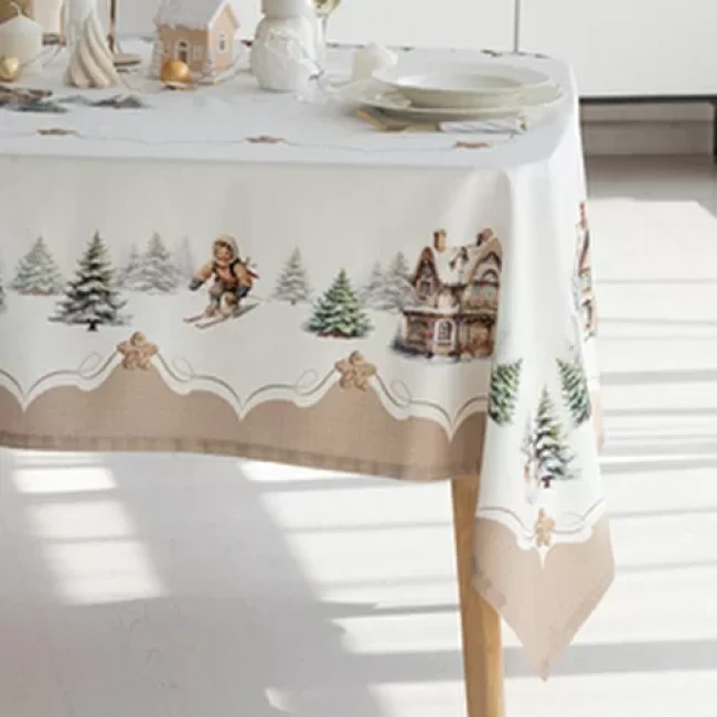 Все скатерти и дорожки коллекции «ПРЯНИЧНЫЙ ДОМИК» выполнены из ткани для столового белья плотностью 180 г/кв.м и имеют специальную пропитку (влаго-, масло- и грязеотталкивающую обработку). Принт на ткани нанесен методом цифровой печати с использованием высококачественных красителей, благодаря чему изделия не линяют и не меняют свой цвет после многократных стирок. Рисунок по ткани виден только на лицевой стороне.