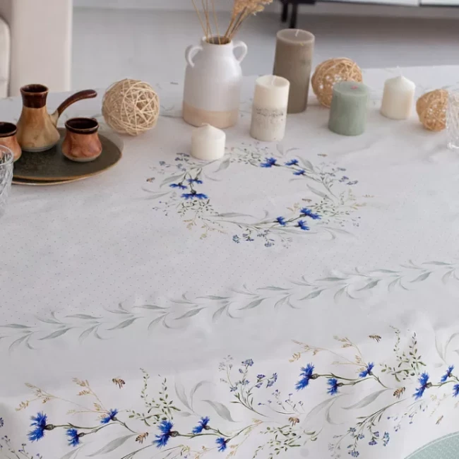 СВОЙСТВА ТКАНИ (состав, плотность, пропитка): Состав ткани 100% хлопок. Все скатерти и дорожки коллекции «ВАСИЛЬКИ» выполнены из ткани для столового белья плотностью 190г/кв.м и имеют специальную пропитку (влаго-, масло- и грязеотталкивающую обработку). Принт на ткани нанесен методом цифровой печати с использованием высококачественных красителей, благодаря чему изделия не линяют и не меняют свой цвет после многократных стирок. Рисунок по ткани виден только на лицевой стороне.