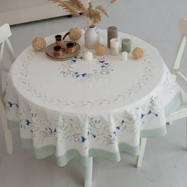 СВОЙСТВА ТКАНИ (состав, плотность, пропитка): Состав ткани 100% хлопок. Все скатерти и дорожки коллекции «ВАСИЛЬКИ» выполнены из ткани для столового белья плотностью 190г/кв.м и имеют специальную пропитку (влаго-, масло- и грязеотталкивающую обработку). Принт на ткани нанесен методом цифровой печати с использованием высококачественных красителей, благодаря чему изделия не линяют и не меняют свой цвет после многократных стирок. Рисунок по ткани виден только на лицевой стороне.